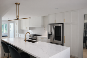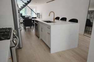 This custom kitchen was designed to create a bright, open-concept space with a sophisticated and welcoming atmosphere. The combination of white shaker-style cabinetry, marble countertops, and warm hardwood flooring delivers a clean yet luxurious aesthetic that enhances the overall value of the home.