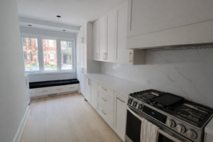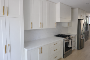 We installed custom-built white shaker cabinets with detailed paneling, offering a timeless and elegant look. The cabinetry extends to the ceiling, maximizing storage while maintaining a seamless, high-end finish.